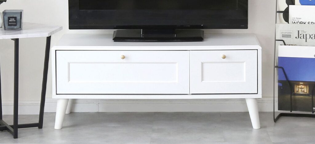 一人暮らしやワンルームにぴったりなサイズ感のローボード。幅90cm×高さ37cmのコンパクト設計で、フロアスタイルの生活にもなじみやすく圧迫感のないすっきりとした空間を演出します。奥行も40cmと程よいサイズ感で、32インチのテレビにも対応可能。シンプルかつスタイリッシュなフラットデザインに加え、框デザインを施した引き出しやシャンパンゴールドの取っ手が上品さをプラスします。